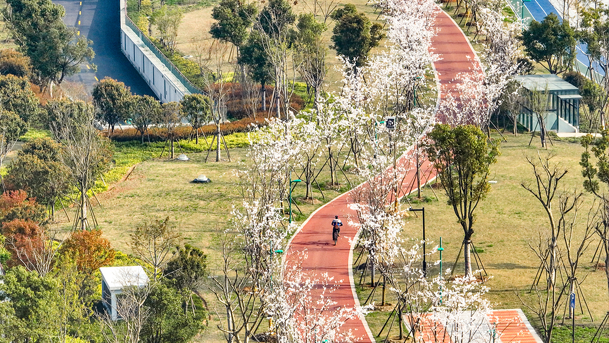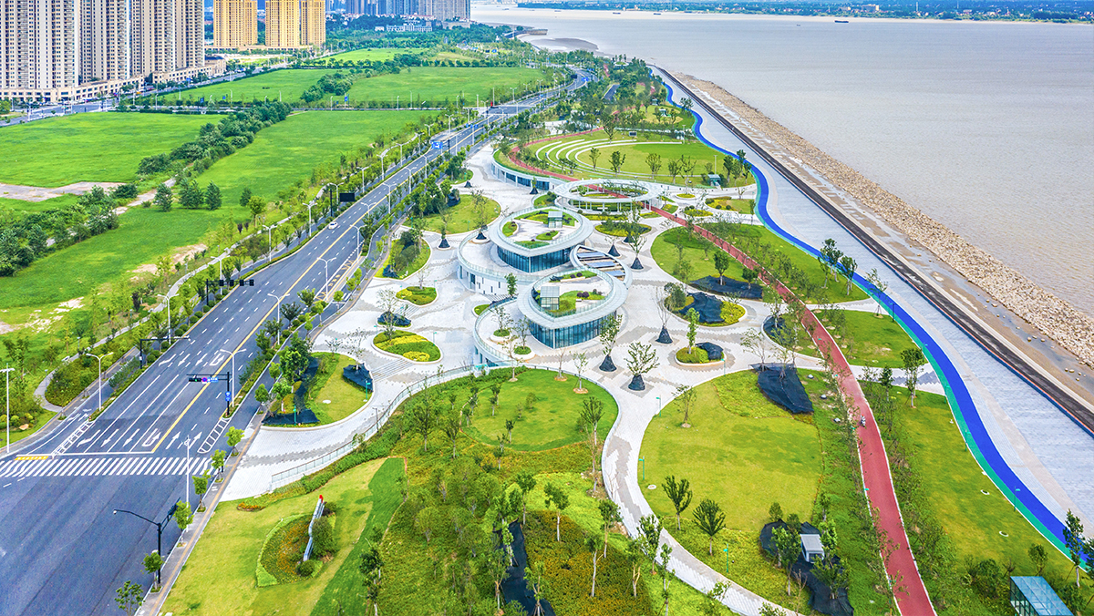 设计以生态绿地为基底,以贯穿场地的五线谱慢行系统为骨架,结合周边地块功能、市政道路以及景观空间韵律,安排运动天地、蝶趣童飞、工业遗址公园、沿江观景台、火炬广场等多个不同功能的节点。