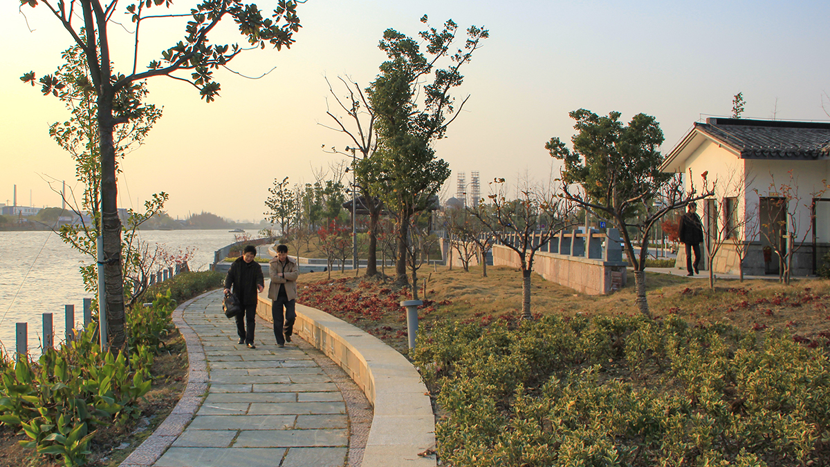 设计根据场地特征,将景观带划分为健身花园、绿色长廊、仁皇记忆、河港风光、休闲乐园五个区段。同时结合周边环境,整合场地的景观资源,通过滨水游步道串连起文化广场、休闲设施、活动草坪、运动场地等一系列服务于周边居民的丰富主题空间,形成与周边公园、景观带密切关联的城市滨水开放空间,成为城市公园体系中不可或缺的一部分。