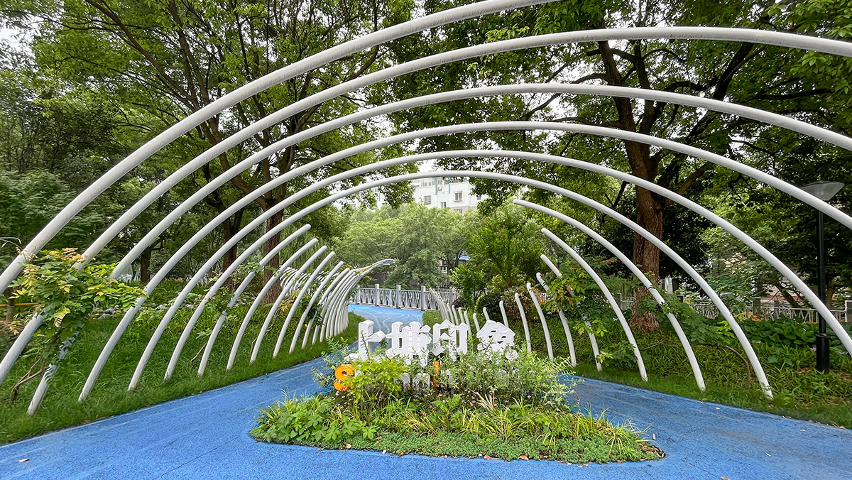 第一块场地位于市区西门下塘,毗邻居住区和小学,由一个杂草丛生、通行不便的绿地空间摇身变为如今“开放共享,交流互动”的邻里口袋公园。设计充分利用现有植被条件,在公园内营造了四个主题鲜明、功能各异的特色节点,由彩色游步道串联,为全龄段使用者提供了交流空间和活动场地,建成后受到了周边市民的广泛好评。公园入口的弧形廊架以丝绸为灵感,白色钢管以不同的弧度模拟丝绸灵动飘移的姿态一路向内延伸,引导游人进入;两侧紫藤花缠绕而上, “无尽夏”绣球花境绵延,同时配以湖蓝色步道,使入口空间显得尤为清新梦幻、引人入胜。林下剧场空间由高低错落的台地式木平台营造而成,通过树池和树洞的形式保留现有乔木,将原有不便进入的郁闭树林改造成为舒朗开阔的临水活动广场。同时木平台上设置了明黄色的钢板桌椅和各类健身设施,提升场地的功能性,是健身休闲、聊天聚会的不二之选。悦动花园是为周边青少年打造的趣味性活动场地,设计顺应场地高差,通过树池和景墙的组合打造半围合的临水空间,明黄色的弧形景墙和蓝绿色的塑胶地面点亮空间,更突显了活泼明快的场地氛围。如今的西门下塘已不再是行人匆匆而过的闲置绿地,而是成为了周边居民休闲生活的一部分。相信随着植被的生长和来年绣球的盛开,这里将成为更多游人的打卡点。
