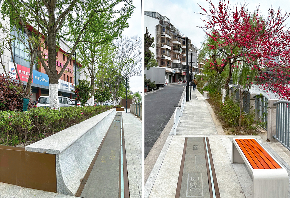 第二块场地是位于市区新开河路临河的条状绿地,位于新开河客运码头的旧址,与南侧的潮音桥相望,曾是湖州水运的重要节点。设计以此为切入点,通过历史景墙、新开河时光带和码头航班信息带这三个文化小品的置入来营造场地亮点,充分展现场地记忆。在设施材质的选择上也以钢板、石材为主,烘托厚重的历史氛围。植被上以保留现有乔木为主,节点处穿插开花植被,点亮水岸空间,营造桃红柳绿、清新明丽的水岸景观风貌。在经过植被梳理、设施更新和文化置入后,新开河码头的记忆得以沉淀,这片临水的狭长空间,在停航的几十年后重新焕发出光彩。