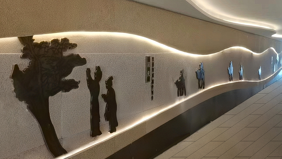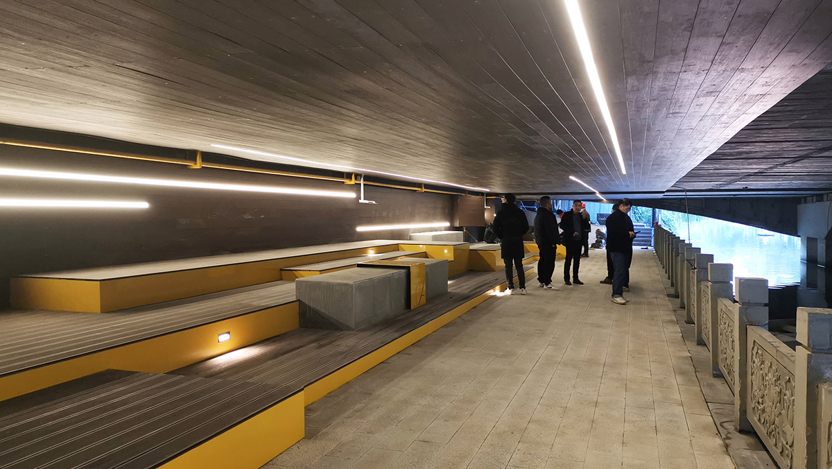 骆驼桥和务前河桥位于市区霅溪公园两端,每座桥下均有相对的南北两个桥洞,供人通行。骆驼桥桥洞设计以丝绸之路为主题,墙面以弧线造型的沙色花岗岩为基底模拟沙漠风光,做旧铜板打造人物和场景浮雕,如徐徐展开的画卷,再现丝绸发展之路。务前河桥桥洞周边茶馆聚集,茶韵氛围浓厚。因此设计以茶田为元素,健康休闲为主题,以深色竹木为面层,明黄色钢板收边的形式打造层次丰富的阶梯式平台,形成集静坐、小型广场舞、听曲、趣味活动等功能为一体的多功能桥下空间。