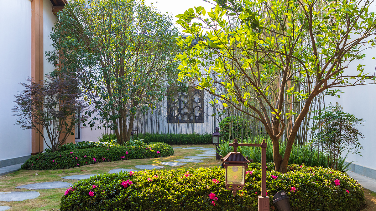 项目广泛运用屋顶花园相关领域创新技术。利用泡沫混凝土、轻质种植土等材料降低屋面负荷;通过塑石假山表现宋式庭院湖石景致;运用宽幅合成橡胶衬垫膜,在有限覆土厚度条件下保障了屋面浅水景观的防水效果;并对采光井、楼梯间、排烟井等屋面设施进行景观美化;通过女儿墙装饰做法,在保障主体建筑外立面幕墙效果的同时,打造围合的中式庭院。