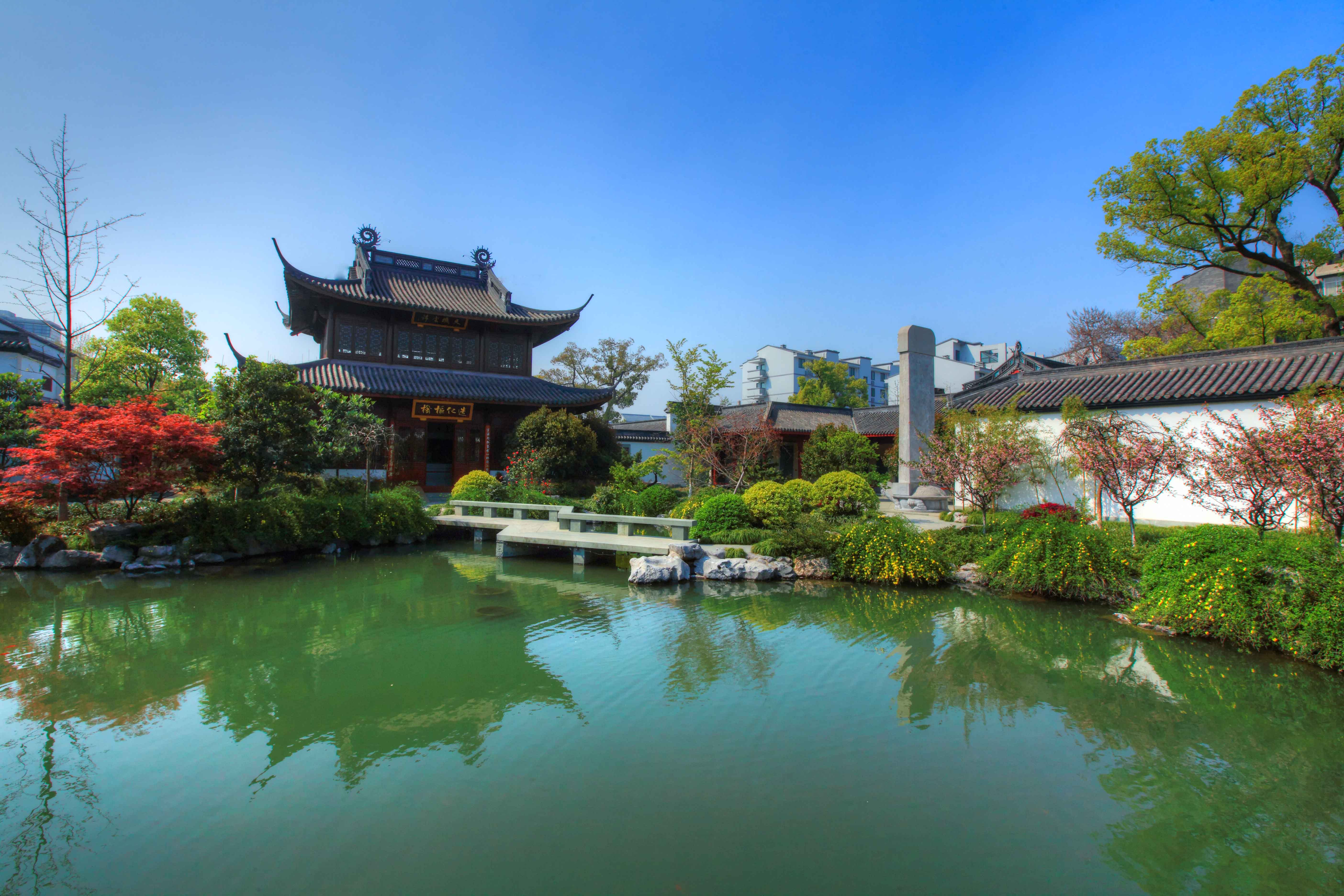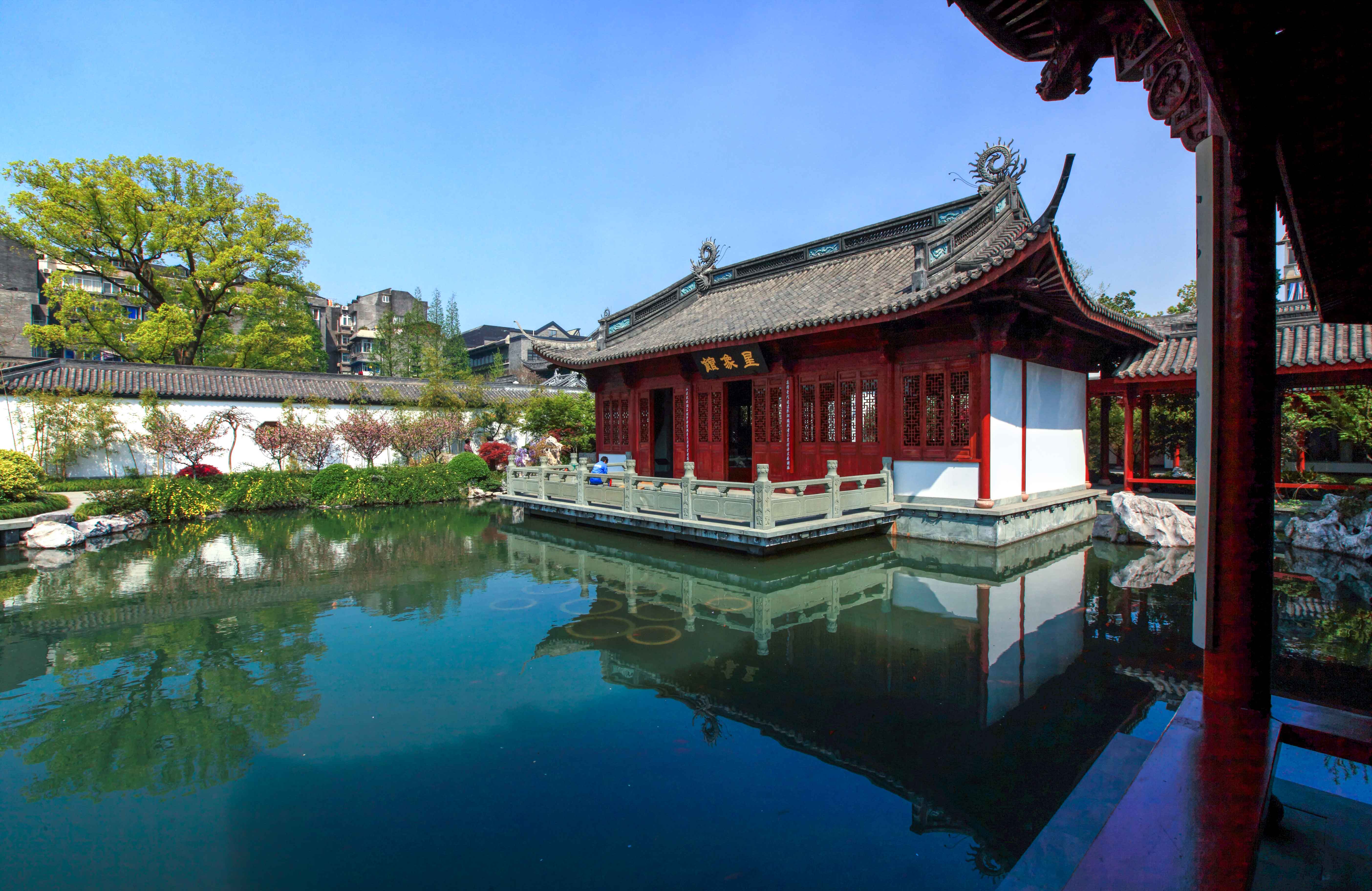 东区为典型的江南园林式庭院,花香鸟语、水流潺潺,各建筑如珍珠般散落其间。水庭位于整个庭院中心,石经阁、星象馆、文昌阁等建筑在假山池水间错落布置,曲折绵长的回廊将它们有机地串联在一起。蕴涵着深厚历史积淀和丰富人文内涵的500多块碑石,被称为是融历史、科学、艺术为一体的“石质书库”,恰当地展示于亭台楼阁之中,与婉约的江南园林融为一体。