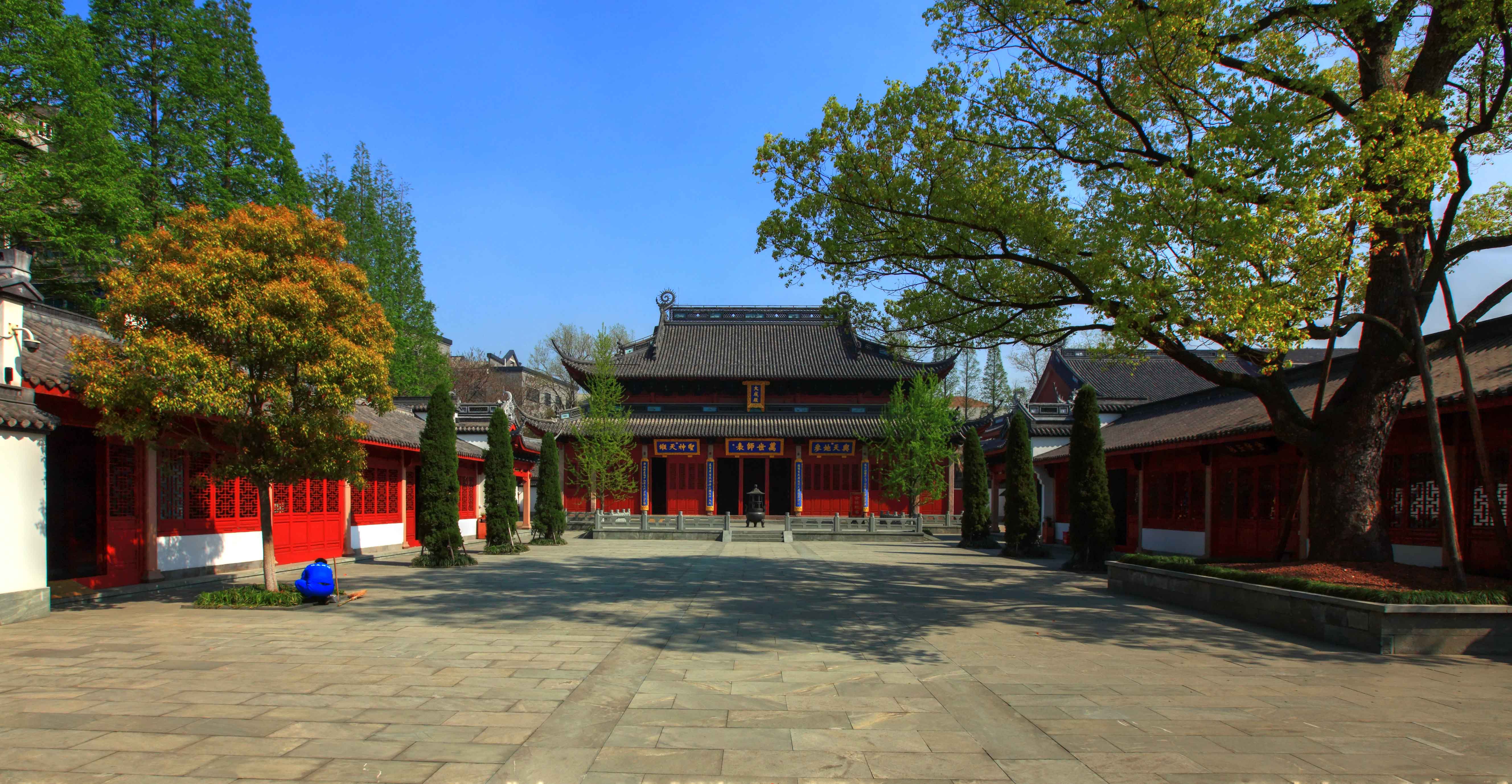 杭州孔庙始建于宋高宗绍兴元年,原为南宋临安府学所在地,位于西湖东南侧吴山脚下。杭州孔庙由东、西两个既相互连贯,又相对独立的区域组成。 西区为杭州孔庙的中轴线,着重展示孔庙的文化精髓。轴线以大成殿为核心,采取均衡对称、规整方正的平面布局,突出了该轴线庄严、肃穆的氛围和孔子作为大思想家的伟大成就和广泛影响。自棂星门而入,共二进:棂星门至大成门为第一进,大成门至大成殿为第二进。这样既完整地保留了孔庙的原有中轴线风貌,又使整个建筑高低错落,动静有序。