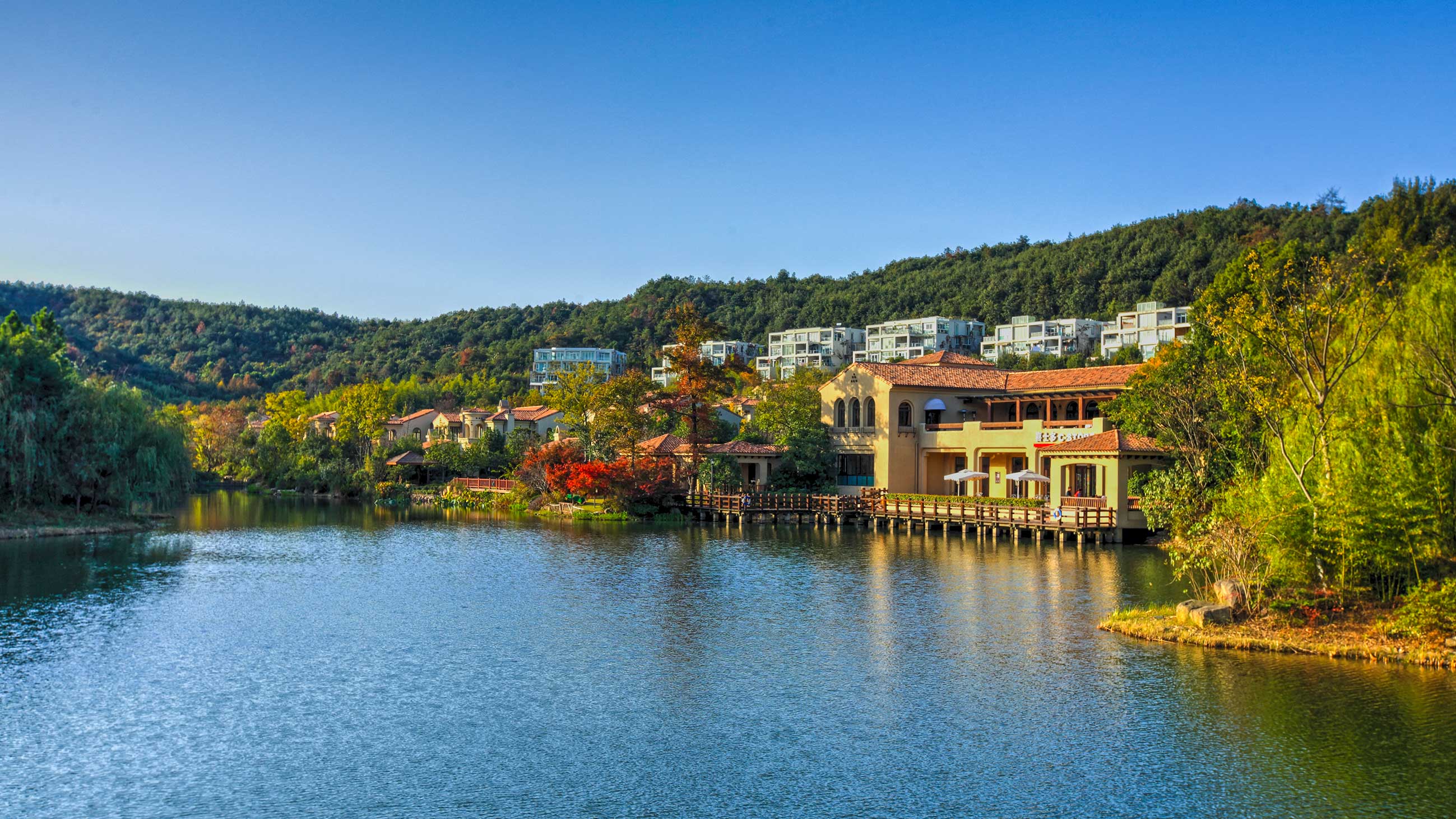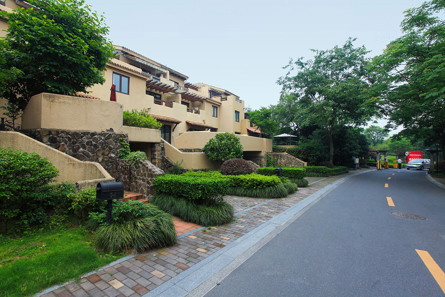 良渚文化村的整体定位与环境特征决定了其自然、自在的景观特质,因而竹径茶语的景观与山地大环境融合、渗透,并形成你中有我、我中有你的格局。设计包括竹径茶语公共景观和私家庭院环境2大部分——整理水系成溪、河、湖,通过不同高差的台地修复地形,以自然式风景林衔接山体林相,庭院植物精心配置。最终实现的亲切、自然、优美的环境,为住户营造了舒适、宜人的生活空间。