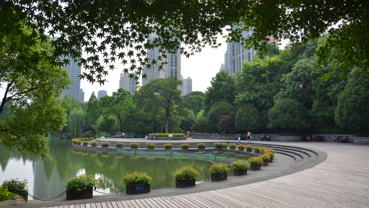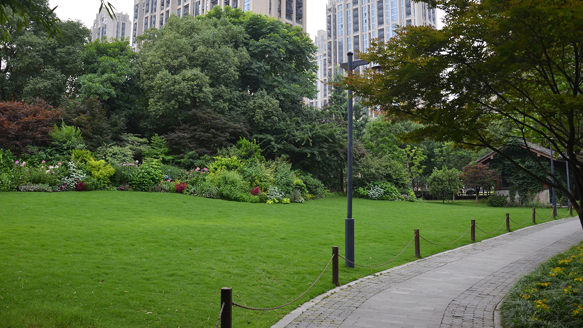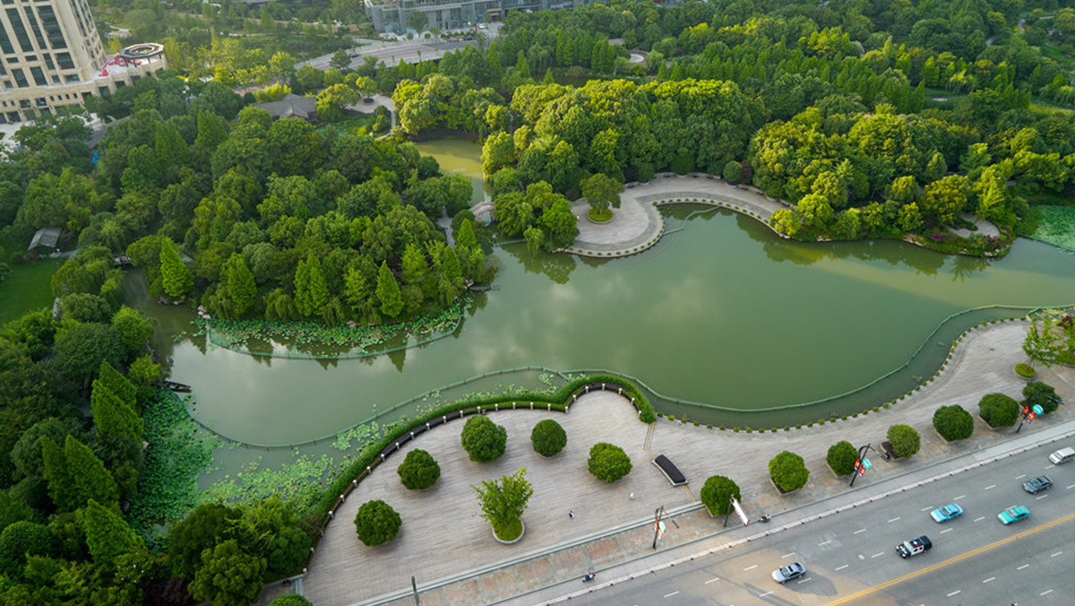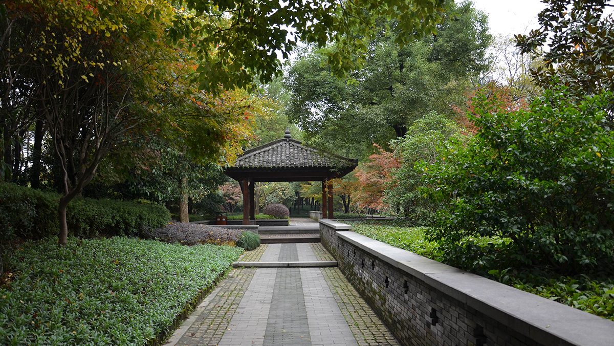 水景公园位于世纪大道以北,新丰路以西,人民路以南,乔司港两侧,总用地面积122.4亩。公园原址为低洼农田和菜地,设计遵循自然生态和以人为本的原则,利用原有洼地和小溪,掇山理水,组合景观空间。以植物造景为主,以地形、绿化、水景、小品等形成园林景观特色。结合地形,修建地下车库,成为临平城西的一块供市民休闲、娱乐的标志性城市中心绿地。