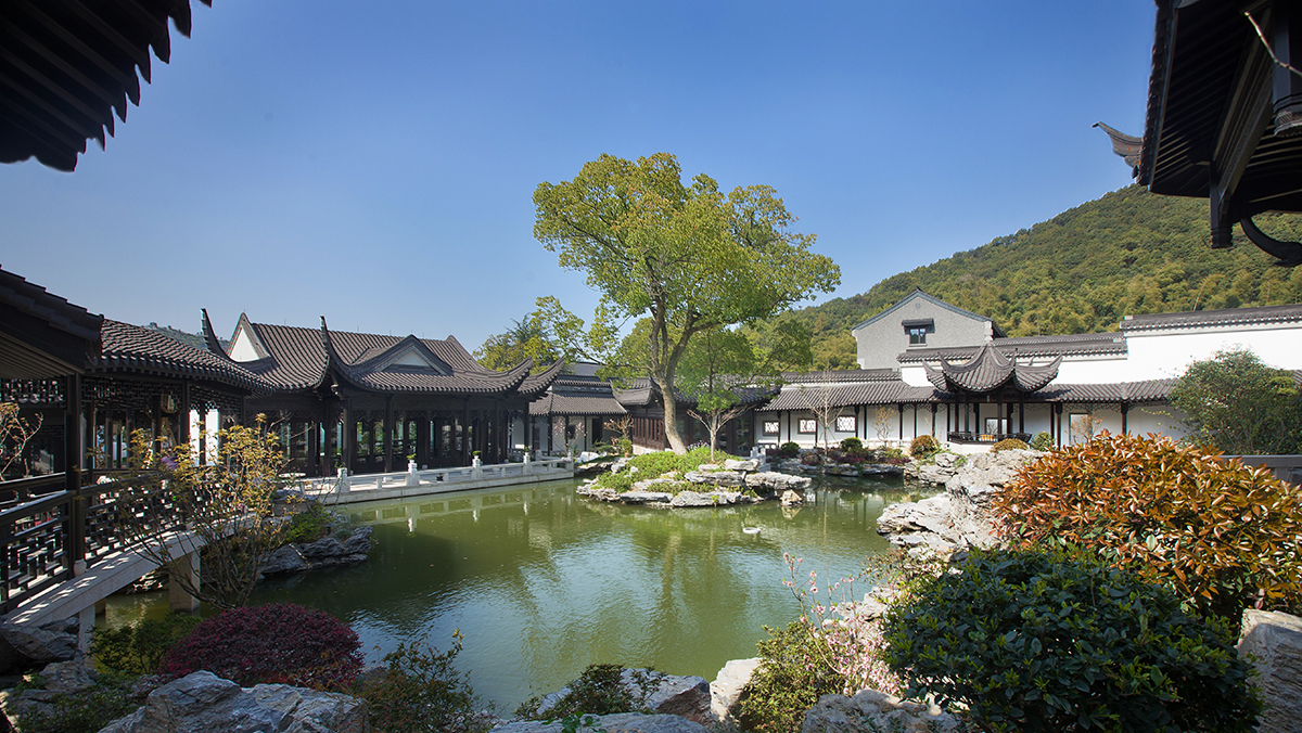 地块环境依山就势,山环水抱,植被繁茂,自然环境优美。设计尊重基地原生地貌,利用原有景观资源,降低对环境的扰动。建筑布局因地制宜,以基地入口中心湖及保留树林为主要景观核心区,两条山林溪流景观区为轴来展开,建筑散落布置,或依山、或傍水,围绕山势道路成组团布局。依据功能分区分别设置餐饮养生馆、会议中心、养生中心、接待中心、养生接待楼。建筑或呈规则三进院落布局,方正大气、内聚四水归堂;或具有传统园林特色,布局周正中见自由,迴廊亭榭楼榭,宛转其间,步移景异。建筑掩映于自然山水景色之中,创造具有中国园林意境的“园中之园”。