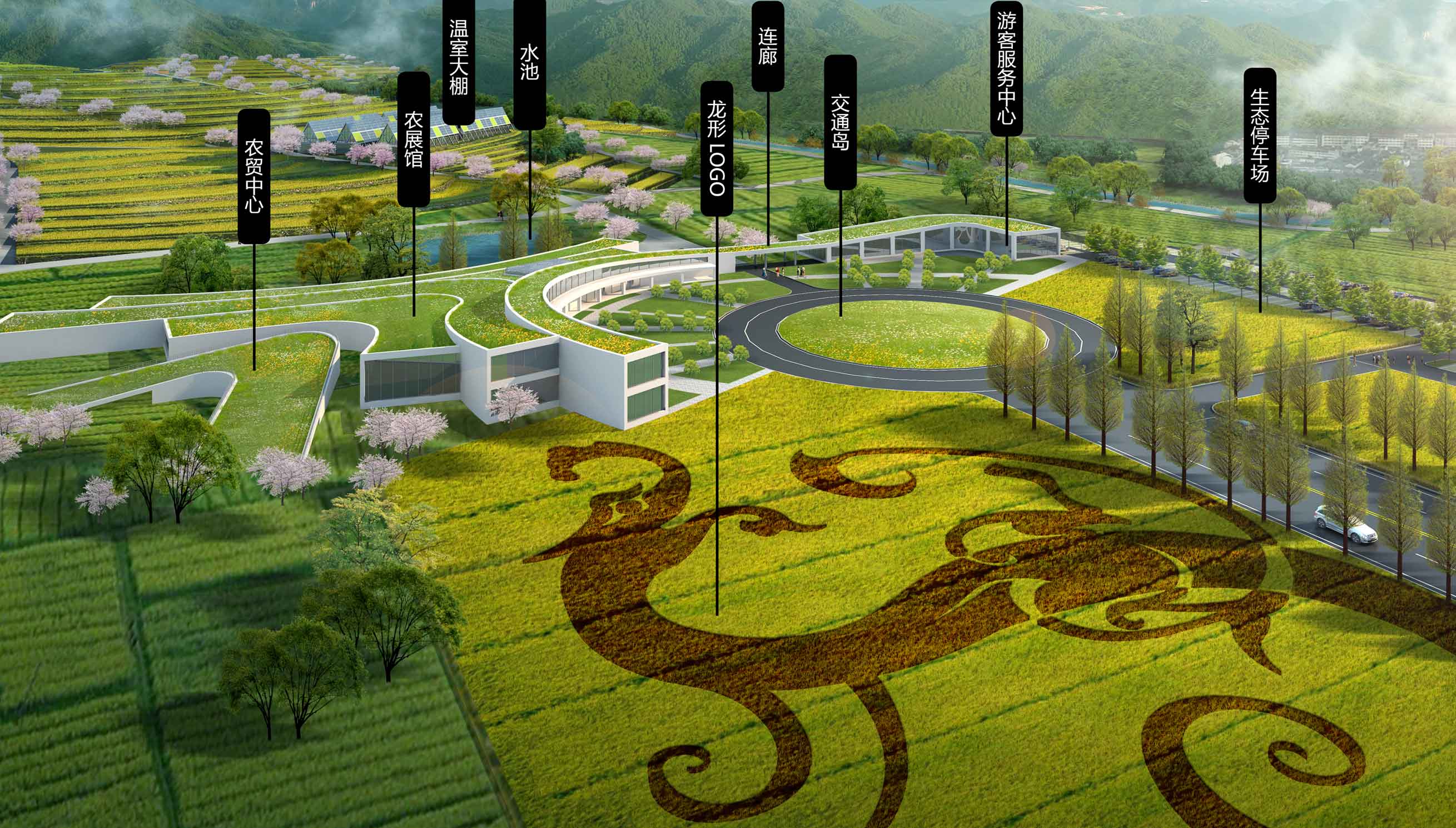 农业公园整体分为五个功能片区,从东到西分别是入口功能,游客服务中心和彩稻图案LOGO,共同形成迎宾的农业景观,同时结合科技农展馆和温室大棚,打造科技农业主题。其次是亲子趣玩主题,利用入口的高人气,和这个片区本身优质的景观条件,设置手工社区、儿童农业学习管和杂粮趣玩科普园;第三个是农牧生产主题,生态养殖厂的选址位于本区域南侧山体上,北侧配置一个高端蔬果研究所;第四个是农耕文化主题,主要利用罗村进行改造,设置农业主题体验观光园,配置一座粮食加工点;第五个是农居主题,主要是利用西侧片区的清幽特征,设置梯团农庄、高端民宿、古村民宿,打造田园居住的片区。