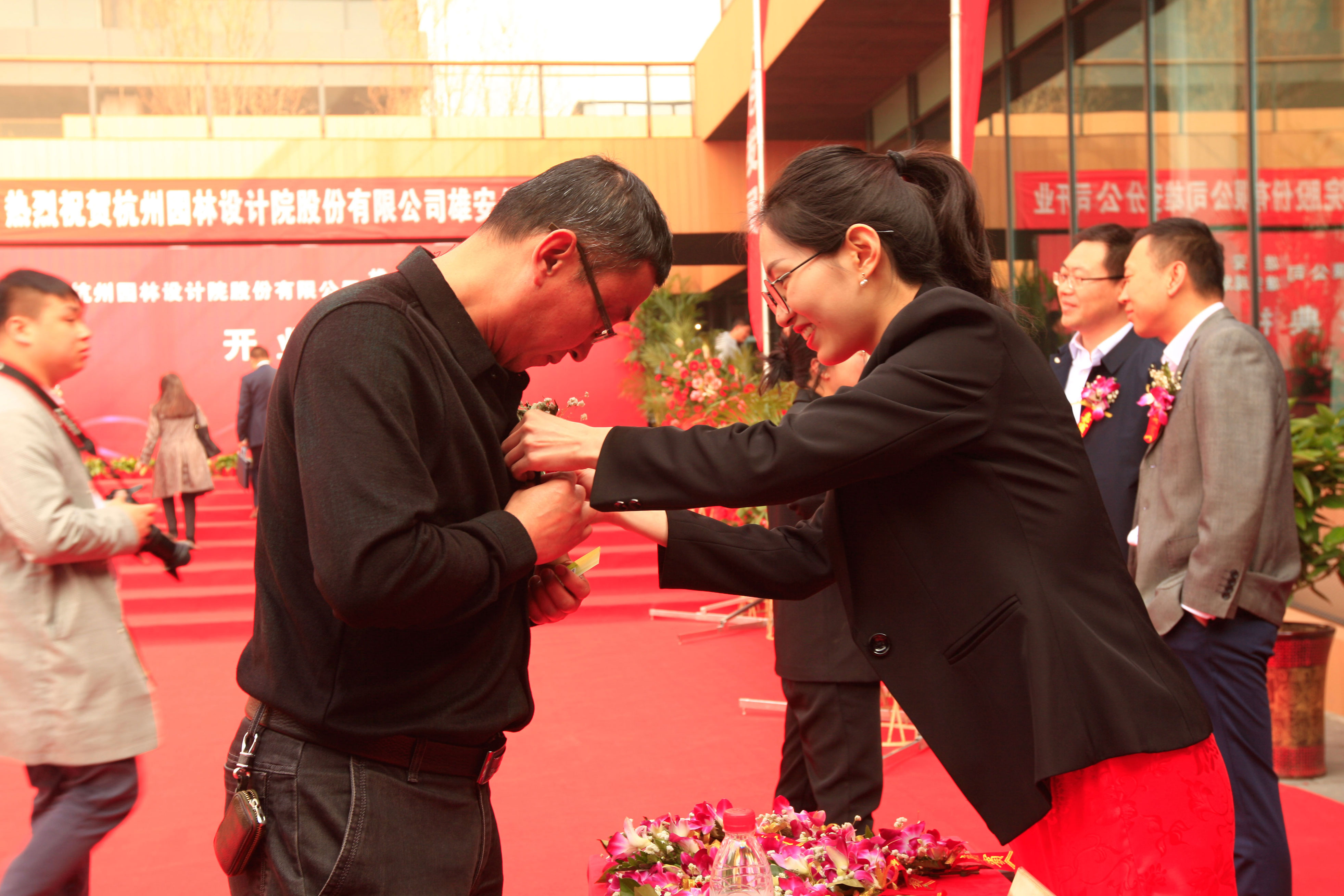 现场工作人员给嘉宾戴花