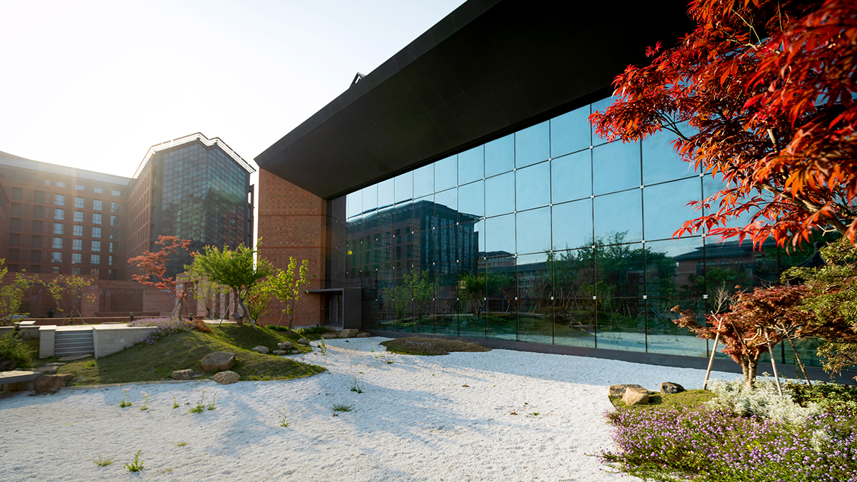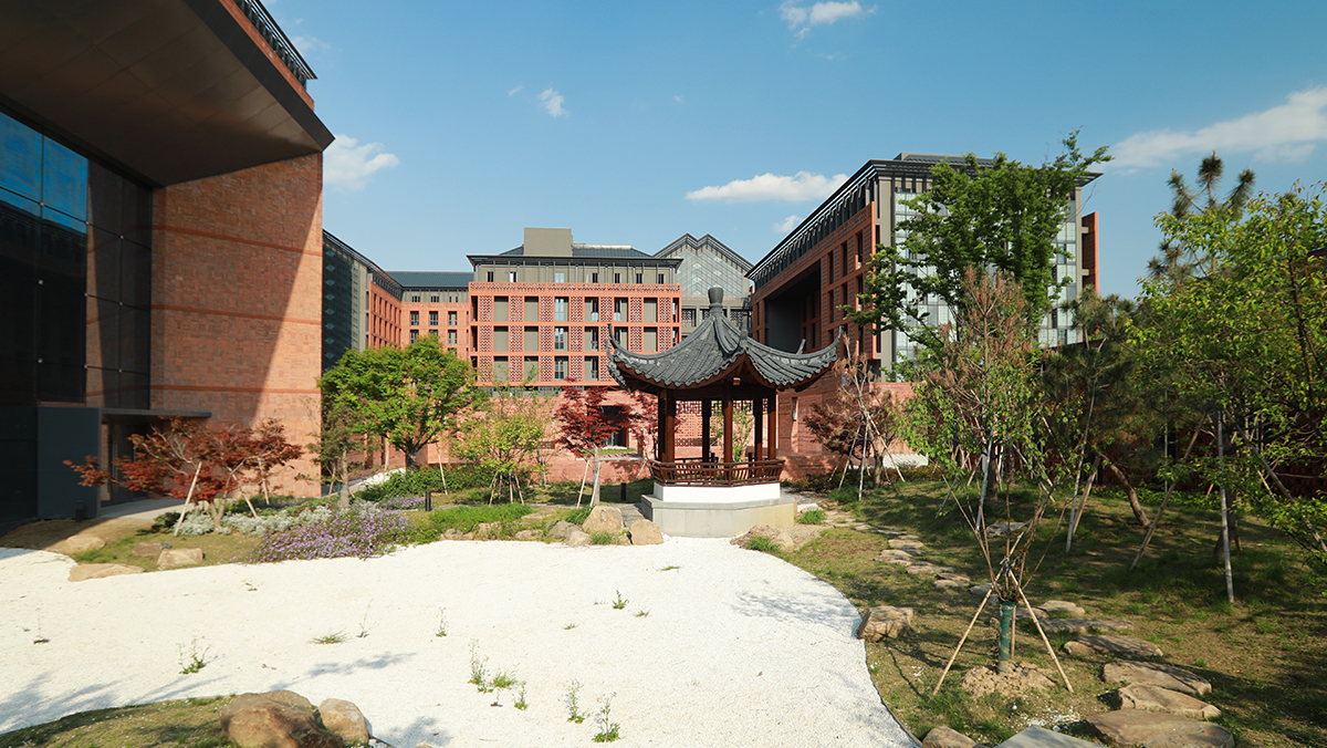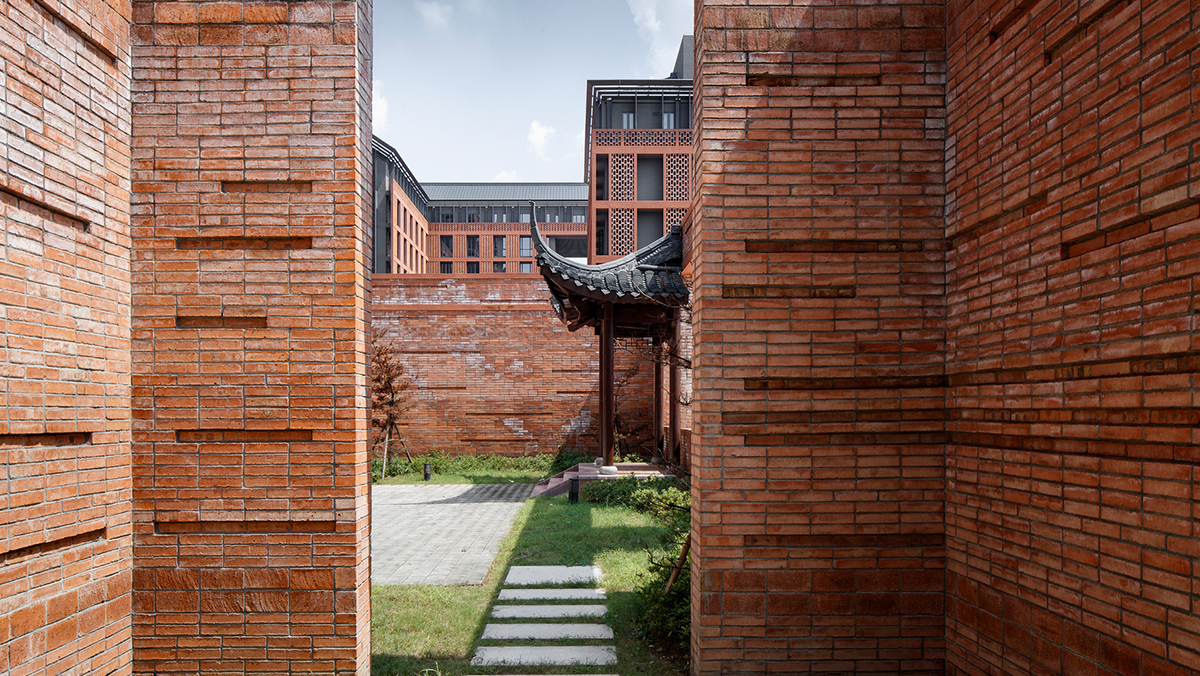 景观设计吸取传统书院的院落空间布局,通过连廊、围墙、过道等要素的组合,营造出有传统韵味的空间形式。景观设计结合建筑布局,在东西组团各设计了一个大庭院,作为最主要的交流活动空间。中心地块的图书馆前为一个中等尺度的庭院,作为室内向外观赏的庭园;另外景观结合建筑功能安排设计了若干特色鲜明的小庭院。庭院之前通过红砖廊道相连接,与建筑融为一体,形成富有空间趣味的交往活动空间。