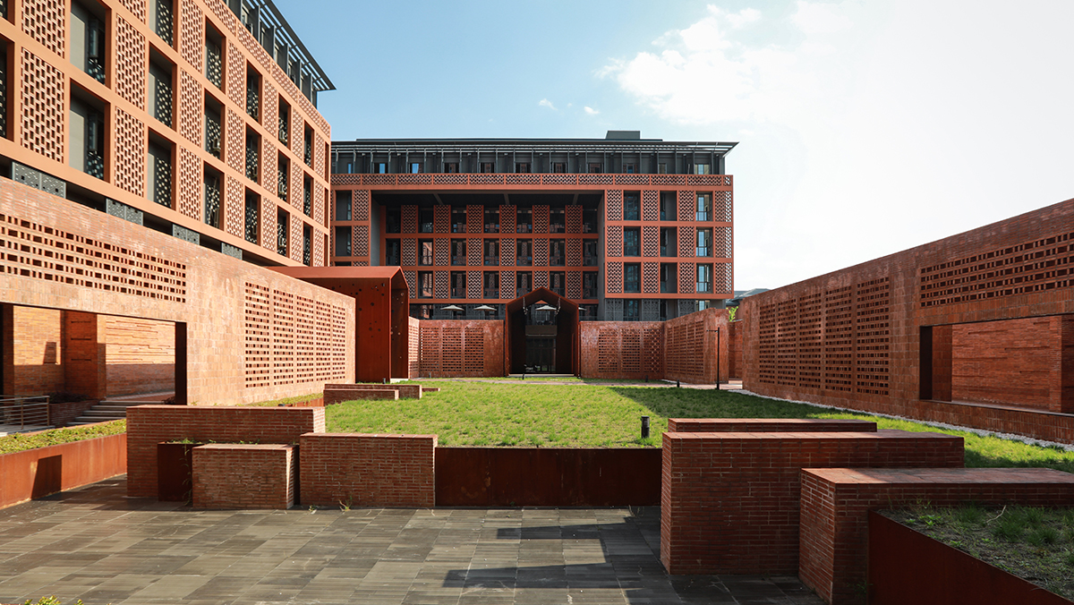 景观设计也对细部做了较深入的思考。光影墙通过红砖的专门构造实现镂空的光影效果;庭院内的回廊采用钢结构做仿木纹漆的做法模拟传统连廊;人文学部的亭子采用半亭的做法;整体铺装采用多种规格的花岗岩,最终通过细节控制达到了相对理想的景观效果。