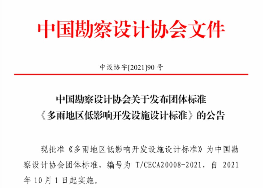 近日,由中国勘察设计协会风景园林与生态环境分会(以下简称“分会”)组织编制的中国勘察设计协会团体标准《多雨地区低影响开发设施设计标准》(编号T/CECA20008-2021)已由中国勘察设计协会批准为团体标准并正式发布。标准将于2021年10月1日起实施。